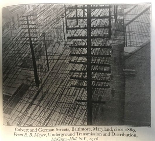 The electrification of America began a few years later, when Samuel Morse’s first telegraph line marched from Baltimore to Washington in 1844…